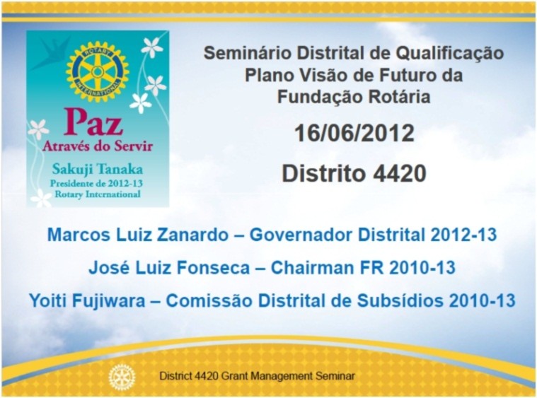 A participação dos companheiros, representando os respectivos clubes neste evento, qualifica os Rotary Clubs para solicitarem os recursos dos Programas de Subsídios da Fundação Rotária. Conforme foi informado por Yoiti Fujiwara do RCSP Aeroporto ? Presidente da Subcomissão Distrital de Subsídios, que coordenou este Seminário, os clubes que foram qualificados poderão enviar os pedidos de Subsídios Distritais até 10 de agosto de 2012, para financiar seus projetos em benefício das comunidades.